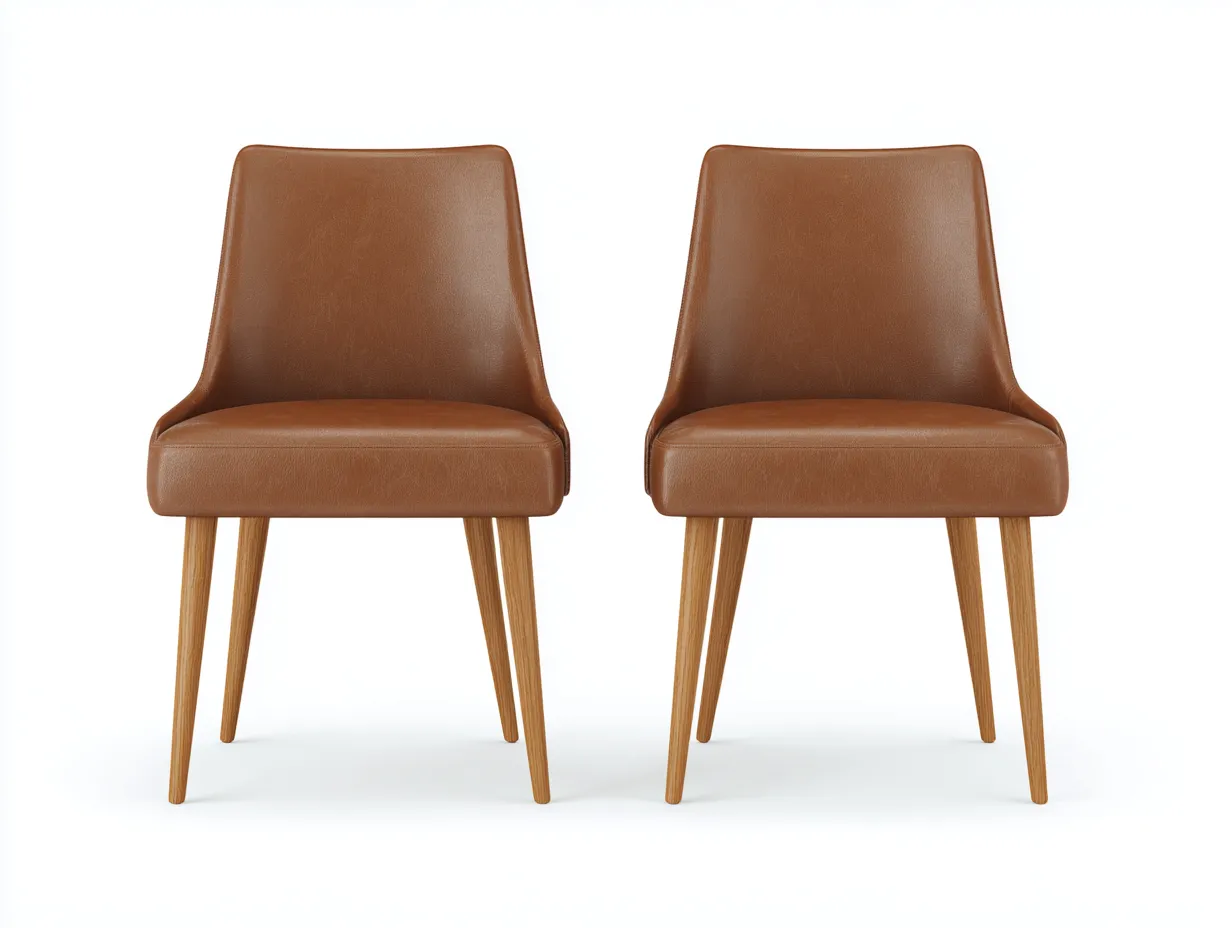 La seduta è rivestita in pelle sintetica marrone con finitura uniforme e resistente all'usura. La base è realizzata in legno, con lavorazione solida e superfici lisce che valorizzano l'aspetto naturale del materiale.