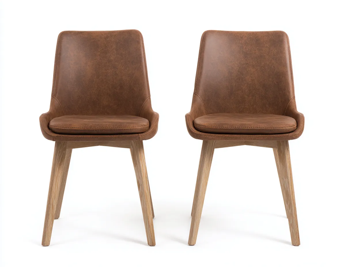 La seduta è rivestita in pelle sintetica marrone con finitura leggermente opaca e resistente. La struttura e le gambe sono realizzate in legno, lavorato con precisione per garantire stabilità e durata nel tempo.
